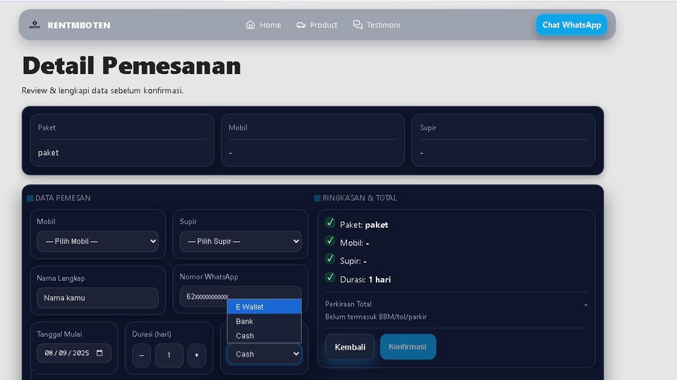Saya seorang Full Stack Web Developer berpengalaman dengan React, Next.js, Tailwind CSS di frontend serta Node.js/Express, Laravel, Prisma ORM di backend. Terbiasa mengelola MySQL, PostgreSQL, SQLite, saya juga menguasai REST API, autentikasi, dan integrasi payment gateway untuk membangun aplikasi web yang stabil dan siap digunakan.