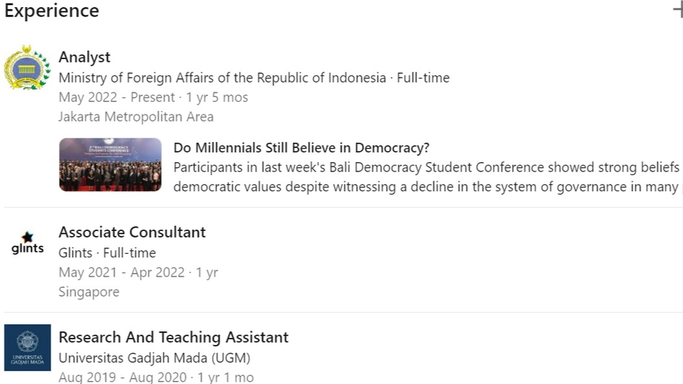 Darulfa memiliki pengalaman sebagai Recruiter, HRD di Glints sebelum bekerja di Kementerian Luar Negeri. Berpengalaman menjadi tutor akademik sejak kuliah di UGM, di mana ia juga telah mempublikasikan berbagai jurnal akademik. Skills: tutoring, akademik, recruiting