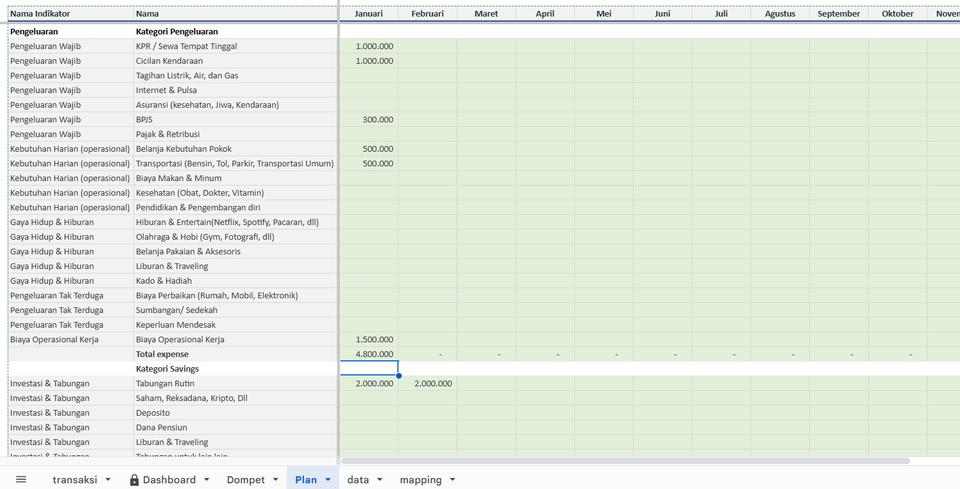 Rp350,0 rbDashboard Google Sheet 1. Laporan Keuangan Otomatis – Menampilkan total pemasukan, pengeluaran, serta saldo akhir setiap bulan secara otomatis. 2. Grafik Interaktif – Visualisasi data dalam bentuk pie chart, bar chart, dan trend analysis untuk memantau pola keuangan. 3. Kategori Keuangan yang Fleksibel – Tambahkan dan sesuaikan kategori pemasukan serta pengeluaran sesuai kebutuhan.