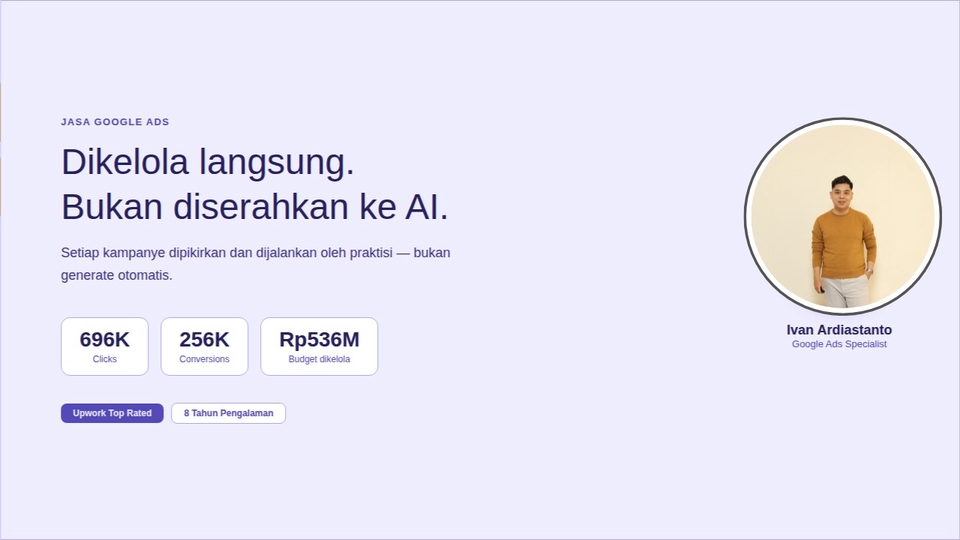 Saya ivan ardiastanto saya seorang digital marketer dan keahlian saya Pengalaman 3 tahun 1. Membuat konten harian 2. SEO ( website + social media ) 3. PPC ( G ads ) 4. Social media marketing 5. Paid advertisement ( google display + FB ads ) 6. Speed up website 7. make website