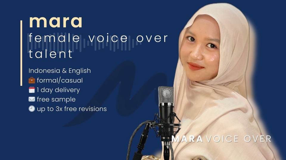Hallo saya Mara- female voice over talent dengan suara jernih dan sesuai dengan kebutuhan anda. Layanan saya meliputi: • Narasi video Youtube, storry telling, edukasi • Iklan • Company profile Klien akan mendapatkan: • Pengiriman cepat (1 hari kerja) • 3x revisi minor • audio berkualitas tinggi (MP3/WAV) Tambahan opsional Hak komersial + 100.000 Bahasa Inggris + 50.000 -Jadikan suara anda terdengar profesional dan berkarakter bersama MARA Voice Over