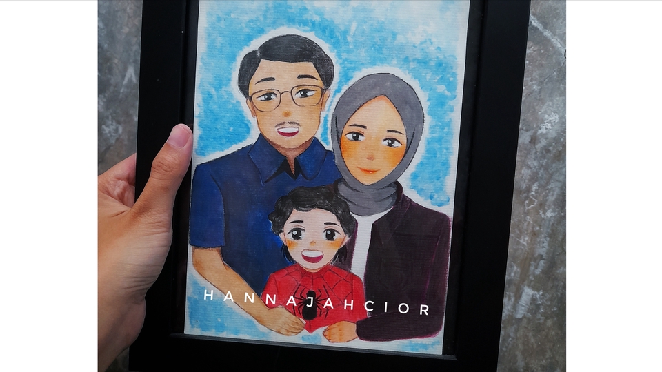 Saya seorang yang suka menggambar. Banyak karya yang sudah saya hasilkan baik untuk koleksi pribadi maupun memenuhi permintaan orang lain. Anda bisa mengecek hasil karya saya di instagram Hannajahcior. Melihat orang lain tersenyum setelah melihat karya saya adalah sebuah kebahagiaan tersendiri di hidup saya. Langkah Pekerjaan 1. Order jasa yang ditawarkan 2. Kirimkan foto referensi 3. Akan dibuatkan sketsa kasar terlebih dahulu 4. Setelah sketsa kasar selesai, orderan akan dikerjakan dengan maksimal 3x revisi 5. Setelah 3x revisi, dan karya fix, orderan sudah selesai 6. Orderan akan dikirimkan ke pelanggan