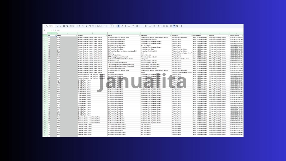 Menawarkan layanan data entri menggunakan Microsoft Excel yang dapat membantu Anda menyelesaikan tugas data Anda dengan cepat dan tepat. 1. Memasukkan data dari berbagai sumber seperti PDF, gambar, formulir kertas, dan lainnya ke dalam Excel. 2. Menyusun data dalam tabel yang rapi dan terstruktur. 3. Kerahasiaan data terjamin. Langkah Pekerjaan 1. Client memberikan data & menjelaskan kebutuhan 2. Review Data