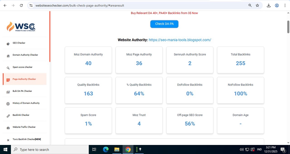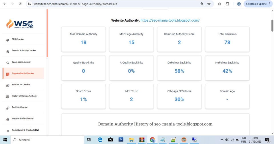 Domain Authority (DA) adalah sebuah skor peringkat mesin pencari yang dikembangkan oleh Moz yang memprediksi seberapa besar kemungkinan sebuah situs web untuk muncul di halaman hasil pencarian (SERP). Skor ini berkisar dari angka 1 hingga 100, di mana skor yang lebih tinggi menunjukkan kemampuan yang lebih besar untuk mendapatkan peringkat teratas. Penting untuk dicatat bahwa DA bukanlah metrik resmi yang digunakan oleh Google dan tidak memiliki pengaruh langsung terhadap algoritma internal mereka; melainkan, DA berfungsi sebagai alat pembanding atau indikator kesehatan profil tautan sebuah domain. Di tahun 2026, di mana mesin pencari semakin mengandalkan kecerdasan buatan untuk menilai kredibilitas, metrik seperti Domain Authority tetap menjadi panduan praktis untuk mengukur otoritas relatif sebuah situs dibandingkan dengan para kompetitornya di ceruk pasar yang sama. Mekanisme perhitungan Domain Authority didasarkan pada data dari indeks web Mozscape dan menggunakan algoritma pembelajaran mesin (machine learning) untuk mengidentifikasi korelasi antara data tautan dengan peringkat di ribuan hasil pencarian nyata. Perhitungan ini mempertimbangkan puluhan faktor, namun yang paling utama adalah jumlah total tautan masuk (backlinks) dan jumlah domain akar yang memberikan tautan tersebut (linking root domains). Jasa apa ini ? Jasa menaikkan DA blog/web Anda sampe DA 30 kadang juga bisa sampe DA 35-40 untuk 2 website/blog anda. Buyer : Berapa hari proses menaikkan DA menggunakan jasa backlink ini ? Seller : 20 hari, tiap website berbeda - beda ada yang cepat ada juga yang lama. Buyer : Apakah ada report backlink ? Seller : Ada, tapi nggak semua backlink saya kasih karena rahasia dapur. Dan report dalam bentuk SS Sebelum DA naik dan SS Sesudah DA naik sampe 3 DA PA Checker menggunakan web ini : https://websiteseochecker.com/bulk-check-page-authority/ Untuk memulai pesanan : Kirim 2 URL Website Anda. Kirim 5 Keyword Anda.