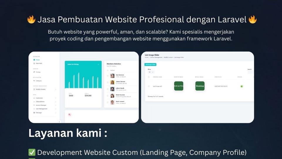 Butuh website profesional, aman, dan scalable? Kami spesialis pengembangan web custom & IT. Menggunakan Laravel, MySQL, JS, & PHP