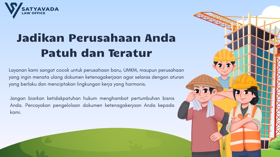 Satyavada Law Office adalah kantor hukum yang menyediakan layanan hukum profesional, praktis, dan berorientasi solusi. Kami berfokus pada pendampingan hukum korporasi, ketenagakerjaan, penyusunan dan review kontrak, serta kepatuhan hukum, dengan mengedepankan integritas, ketepatan, dan kepastian hukum bagi klien.