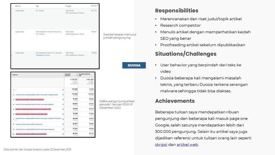 Saya adalah content writer dan copywriter yang berpengalaman menulis artikel web dari 2016 hingga kini. Proyek atau website yang sudah saya kelola antara lain adalah duosia.id dan toktiktok.com. Saya juga melakukan keyword research dan SEO optimization pada artikel-artikel tersebut.