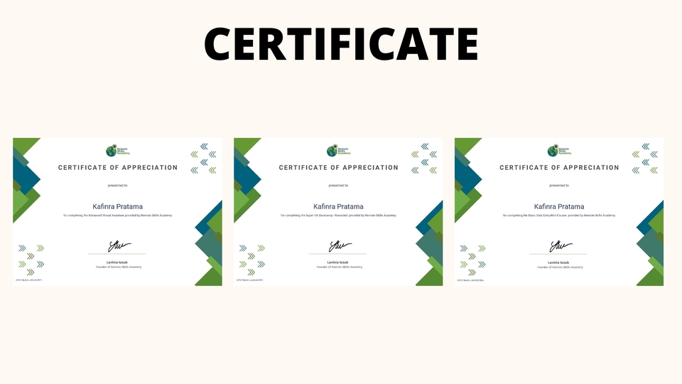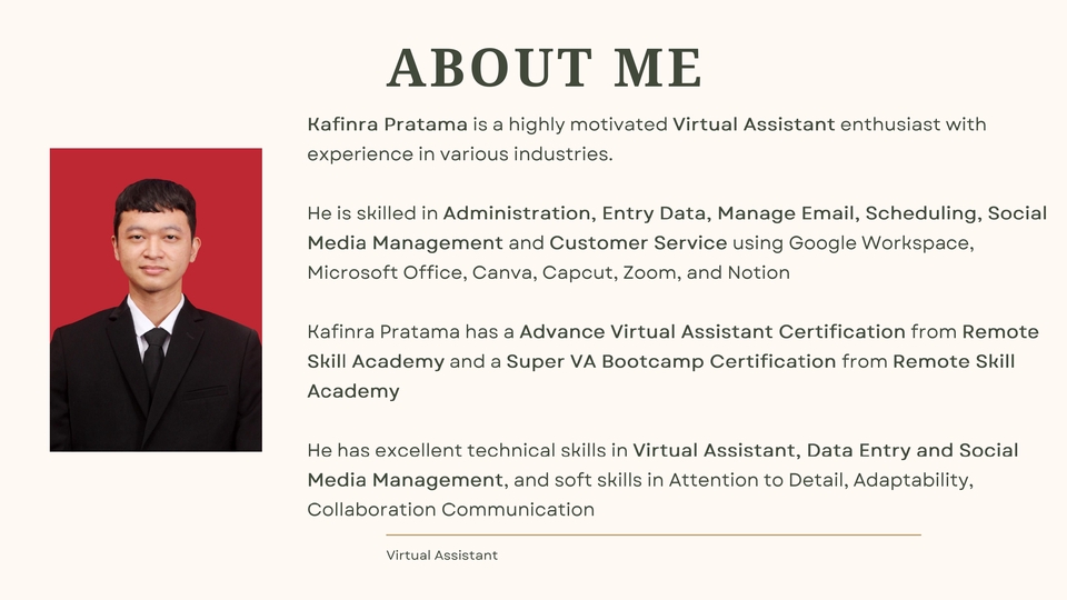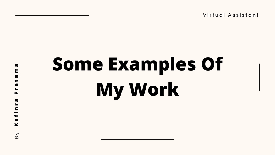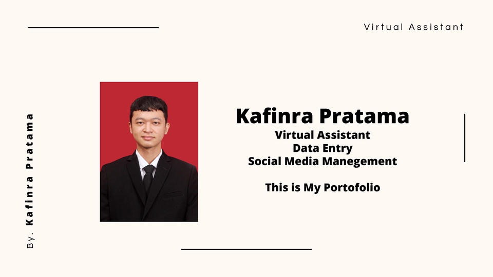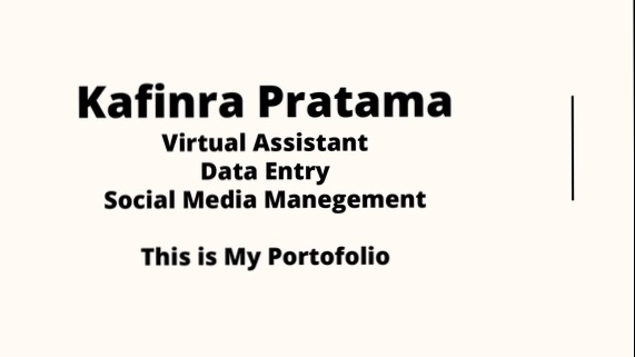 Halo! Saya Kafinra Pratama (Kevin), seorang Virtual Assistant profesional yang mensupport di bidang administrasi, data entry, dokumentasi, UMKM dan Social Media Management. Saya siap membantu Anda menyelesaikan tugas-tugas administratif secara efisien dan akurat Layanan yang saya tawarkan: -Data Entry (Excel, Google Sheet, input data sistem) -Pengarsipan & dokumentasi (softcopy & hardcopy) -Pengelolaan email, jadwal, dan reminder -Follow-up vendor/klien -Social Media Management -Pembuatan PPT dan Pitch Deck -Layanan customer support via chat/email -Riset & input data online -Editing dokumen (PDF, Word) -Input & update produk di e-commerce -Support UMKM dan Start Up Langkah Pekerjaan 1. Konsultasikan Project 2. Sampaikan Detail Project 3. Sepakati Project 4. Penyampaian Hasil Awal 5. Revisi 6. Penyetujuan dan Deal