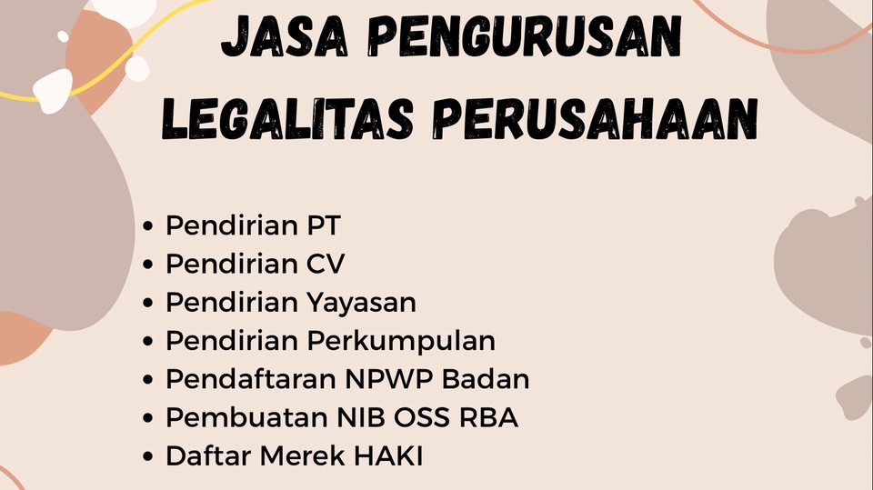 Pendirian Perseroan Terbatas (PT) Pendirian Persekutuan Komanditer (CV) Pendirian Yayasan Pendirian Perkumpulan Perubahaan Akta PT dan CV Jual Beli Saham Perubahan Direksi dan Komisaris Pengurusan Pendaftaran MEREK Pengurusan Jasa Pengurusan Transportasi (JPT) Pengurusan Izin Alkes Penerbitan NIB OSS RBA Perubahan Data OSS Perubahan Data NIB Pelaporan LKPM per 3/6 Bulan Pengurusan Izin Lingkungan SPPL