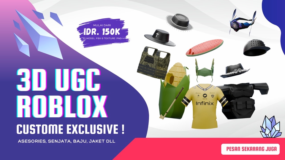 Selamat datang di jasa saya Hai, saya bisa membuat aset UGC Roblox untuk Anda, baik itu properti, aksesori, atau senjata untuk karakter Roblox yang Anda inginkan. Buat item game Roblox sesuai dengan imajinasi Anda sekarang! Sebelum memesan jasa saya, beritahu saya aset apa yang Anda inginkan, Anda bisa memberikan saya sketsa atau contoh gambar sesuai dengan yang Anda inginkan. Catatan: Saya hanya membuatkan modelnya dan memberikan format file-nya. Langkah Pekerjaan 1. Beritahu model seperti apa yang di inginkan 2. Sertakan referensi gambar yang di inginkan 3. Memulai proses pembuatan 3D 4. Melakukan pengecekan dalam roblox studio 5. Mengirimkan hasil model untuk di review