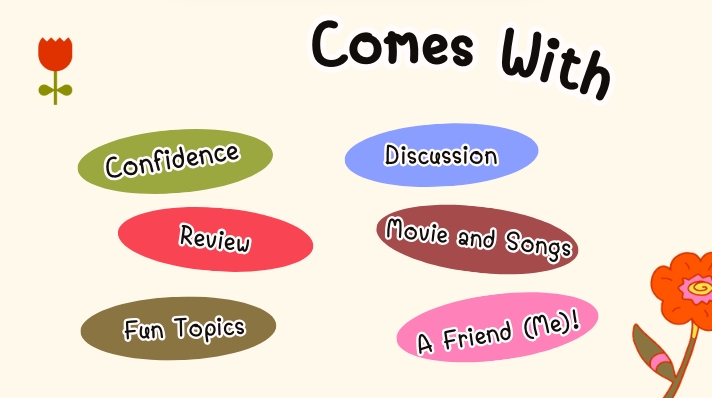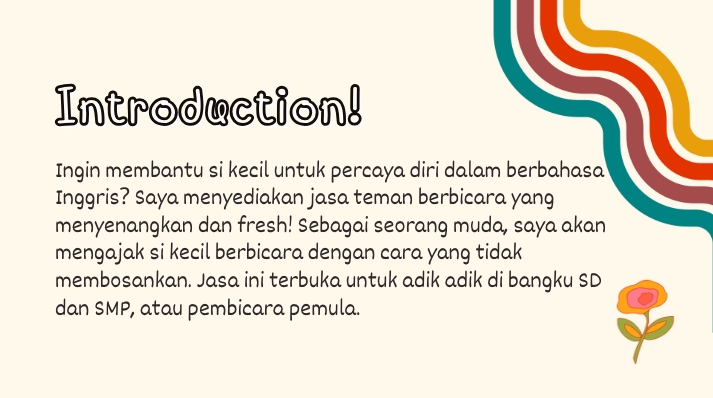 Halo! Saya menawarkan jasa teman berbicara bahasa inggris untuk adik-adik SD dan SMP. Saya dapat mengajak berbicara dengan cara yang menyenangkan sesuai topik yang diinginkan atau disukai. Dengan ini, si kecil dapat menjadi lebih percaya diri dan berani dalam berbicara bahasa inggris. Langkah Pekerjaan 1. Diskusi bersama orang tua terkait target yang ingin dicapai, 2. Diskusi terkait tanggal pelaksanaan (Via Zoom / Google Meet), dan topik yang ingin dibahas, 3. Pelaksanaan Zoom / Google Meet sesuai kesepakatan, 4. Review hasil percakapan dan feedback.