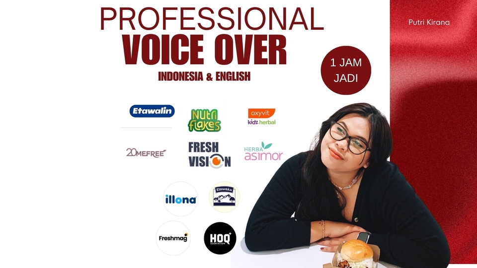 Haloo, Saya Putri! Saya bisa membantu anda untuk membuat video anda lebih hidup dan menarik dengan suara yang bisa anda request sesuai dengan kebutuhan anda. Fun, formal, lembut, anggun, cepat, semua bisa. Bahasa yang bisa digunakan : Indonesia & English (Fluent) Langkah PekerjaanUntuk Voice Over Wanita 1. client memberikan naskah 2. client memberikan briefing terkait intonasi, speed, dan mood yang dinginkan 3. sample vo dikirimkan sesuai briefing 4. penawaran kerja di tawarkan 5. Voice Over di kerjakan 6. Hasil file Voice Over dikirimkan Langkah Pekerjaan 1. Briefing Naskah fix 2. Briefing intonasi naskah sesuai request 3. Dealing pembayaran dengan client 4. Proses VO 5. Penyerahan VO