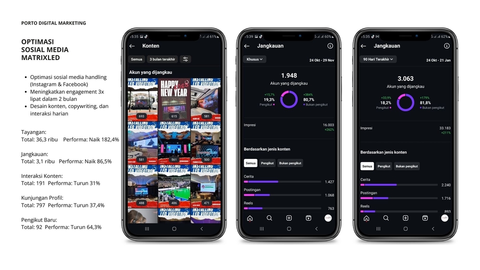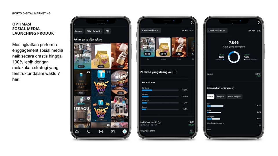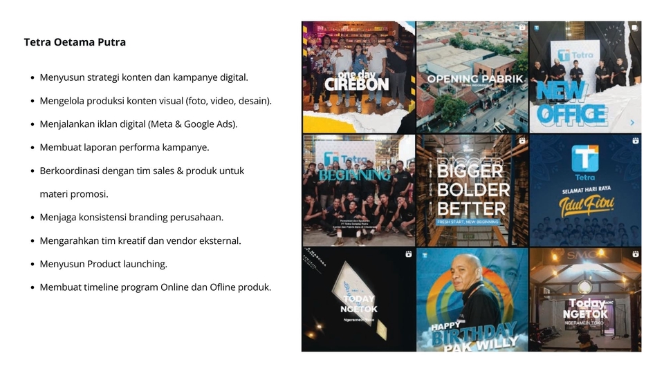 Social Media Handling Kami mengelola media sosial dengan alur kerja yang terstruktur untuk memastikan setiap konten tepat sasaran dan menghasilkan performa optimal. Content Planning Menyusun strategi berdasarkan tujuan brand (branding, engagement, atau sales). Membuat content calendar yang memuat tema, topik, dan jadwal posting. Menentukan format konten (foto, video, reels, carousel, atau stories). Content Production Melakukan riset tren dan insight audiens. Produksi konten visual (foto & video) sesuai guideline brand. Menyusun copywriting yang relevan dan engaging. Scheduling & Upload Mengatur jadwal posting sesuai prime time audiens. Menggunakan tools scheduling untuk konsistensi. Memastikan kualitas visual, caption, hashtag, dan tagging brand teroptimasi. Optimization & Monitoring Melakukan optimasi engagement melalui interaksi (reply, DM, komentar). Monitoring performa konten dengan insight data. Menyesuaikan strategi berdasarkan hasil analisis mingguan/bulanan. Dengan strategi ini, performa engagement sosial media bisa meningkat signifikan hingga lebih dari 100% hanya dalam 7 hari.