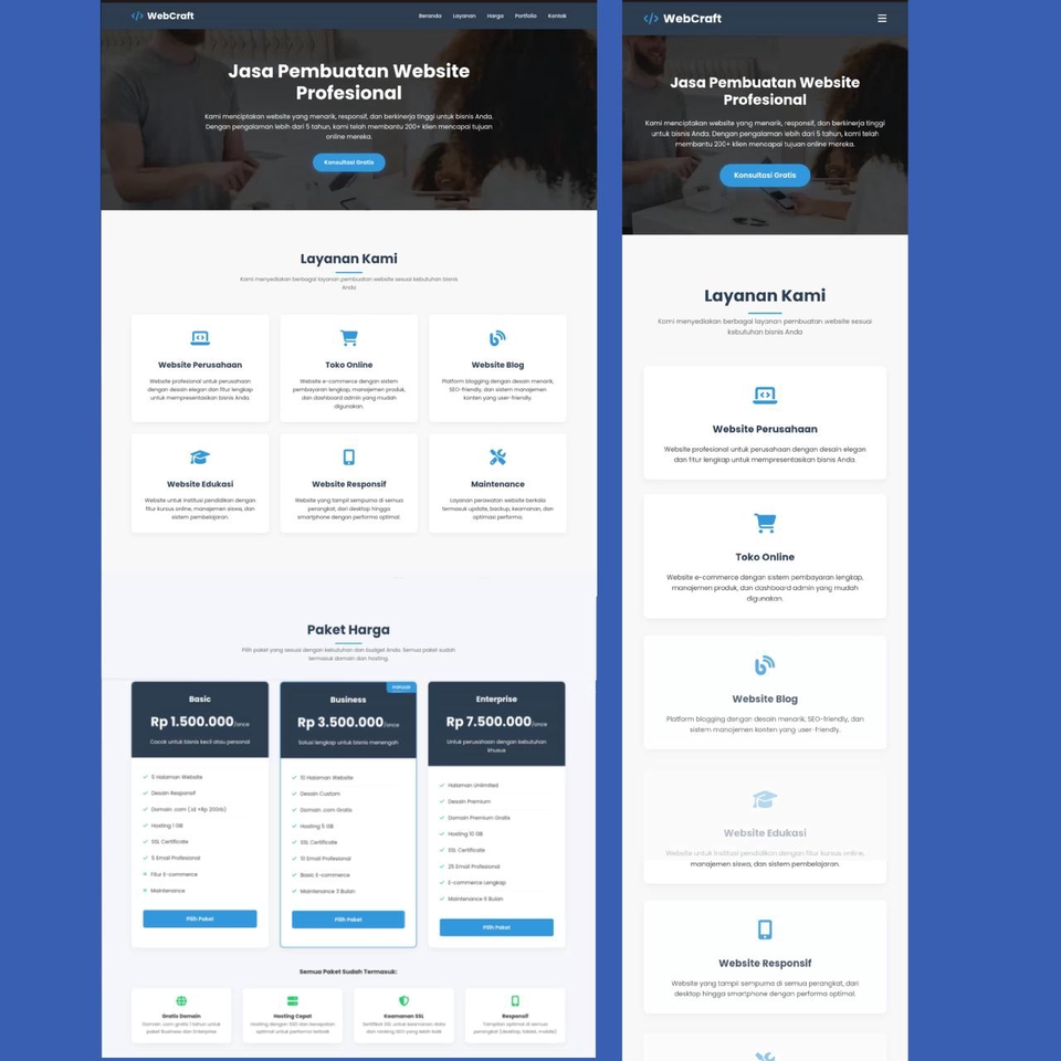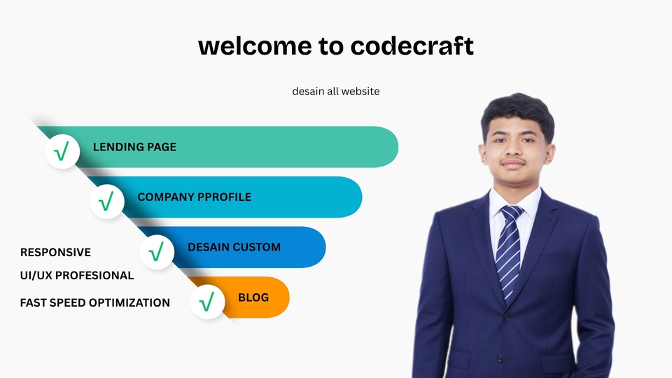 Saya adalah seorang Frontend Web Developer yang berfokus pada pembuatan website dengan tampilan modern, responsif, dan cepat diakses. Saya mengutamakan desain yang menarik, user experience yang nyaman, serta kode yang bersih dan efisien. Saya berpengalaman membuat berbagai website statis maupun dinamis yang disesuaikan dengan kebutuhan bisnis atau personal branding. Dengan menggunakan HTML, CSS, dan JavaScript, saya mampu mengubah desain menjadi tampilan web yang profesional dan fungsional di semua perangkat. Keahlian saya meliputi: Pembuatan landing page interaktif dan website company profile yang menarik perhatian pengunjung. Penggunaan framework modern seperti Tailwind CSS dan Bootstrap untuk tampilan yang rapi dan responsif. Implementasi animasi ringan dan efek interaktif agar website terasa hidup. Optimasi kecepatan website (loading cepat) serta struktur SEO dasar agar mudah ditemukan di Google. Pembuatan desain dari nol berdasarkan referensi atau template yang disesuaikan dengan identitas brand. Saya selalu berusaha memberikan hasil terbaik dengan mengutamakan estetika, performa, dan kepuasan klien. Bagi saya, website bukan sekadar tampilan, tapi cerminan identitas bisnis yang membangun kepercayaan dan profesionalitas.