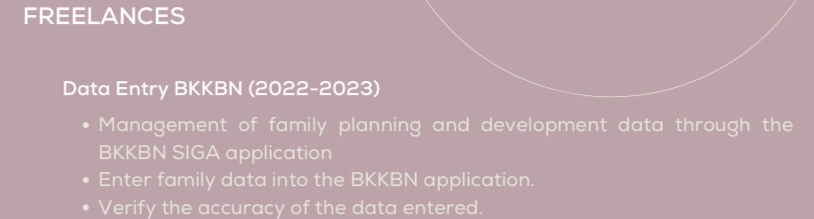 Berpengalaman dalam mengumpulkan informasi data, mampu memproses dokumen dan memasukkannya ke dalam database atau sistem pengumpulan informasi lainnya. Mampu mengoperasikan Microsoft Office dan Google Workspace Langkah Pekerjaan 1. Klien memesan jasa entri sesuai yang diinginkan melalui Fastwork 2. Berdiskusi mengenai rincian pekerjaan, deadline, dll 3. Penetapan harga oleh Freelancer 4. Peninjauan oleh Klien. Jika setuju, klien membayar pekerjaan 5. Setelah pembayaran full terkonfirmasi, Freelancer memulai pengerjaan 6. Freelancer akan mengirimkan hasil pekerjaan sesuai format yang telah disepakati (DOCX, PDF, dll)