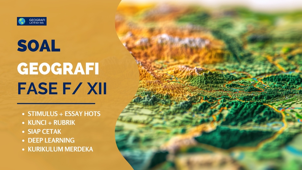 Halo! Saya Latifah, guru Geografi SMA. Saya menyediakan soal Kurikulum Merdeka berbasis Deep Learning: pilihan ganda berbasis stimulus dan esai analitis, lengkap dengan kunci dan rubrik. Soal kontekstual, mendorong HOTS, dan terintegrasi PBL. Topik fleksibel sesuai CP/ATP. Soal original, rapi, siap cetak, revisi gratis 1x