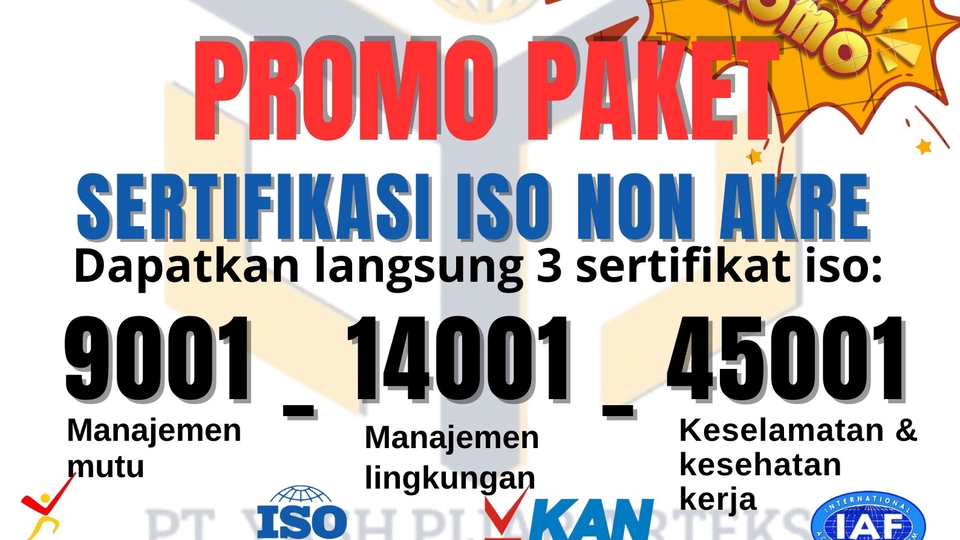 🥳 PROMO SPESIAL PAKET ISO ✅ ISO 9001 – (Manajemen Mutu) ✅ ISO 14001 – (Manajemen Lingkungan) ✅ ISO 45001 – (Keselamatan & Kesehatan Kerja) Keuntungan yang Anda Dapatkan: ✔ Laporan Audit ✔ Manual Mutu ✔ Sertifikat ISO (9001, 14001, 45001) ✔ Softcopy & Hardcopy 🔥 Promo Terbatas – Konsultasi Sekarang! 🔥