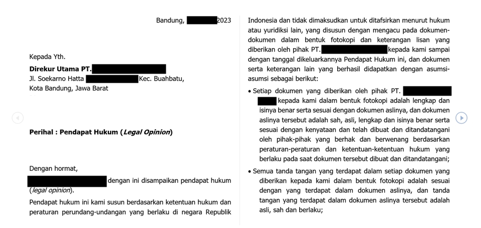 Legal opinion adalah pendapat hukum tertulis yang memberikan klarifikasi dan panduan tentang persoalan hukum Anda secara spesifik, sehingga dapat membantu Anda dalam mengambil keputusan yang tepat serta meminimalisir risiko. Baik untuk keperluan bisnis, kerjasama, sengketa hukum, atau permasalahan hukum lainnya. Adanya Legal opinion sangat penting untuk memastikan keputusan Anda sesuai dengan hukum yang berlaku. Langkah Pekerjaan 1. Konsultasi dan Pengiriman Dokumen dari Klien; 2. Analisis dan Penyusunan Legal Opinion; 3. Penyampaian Hasil dan Diskusi; 4. Waktu pengerjaan dihitung sejak Klien menyatakan dokumen yang diserahkan lengkap.