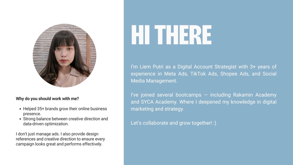 I have 3 years of experience as a Performance Marketer, and have worked with 35+ brands across industries such as fashion, beauty, F&B, and corporate merchandise. Services: • Meta Ads (Facebook & Instagram) • TikTok Ads • Shopee Ads & Tokped Ads • CPAS Let's do collaborate!