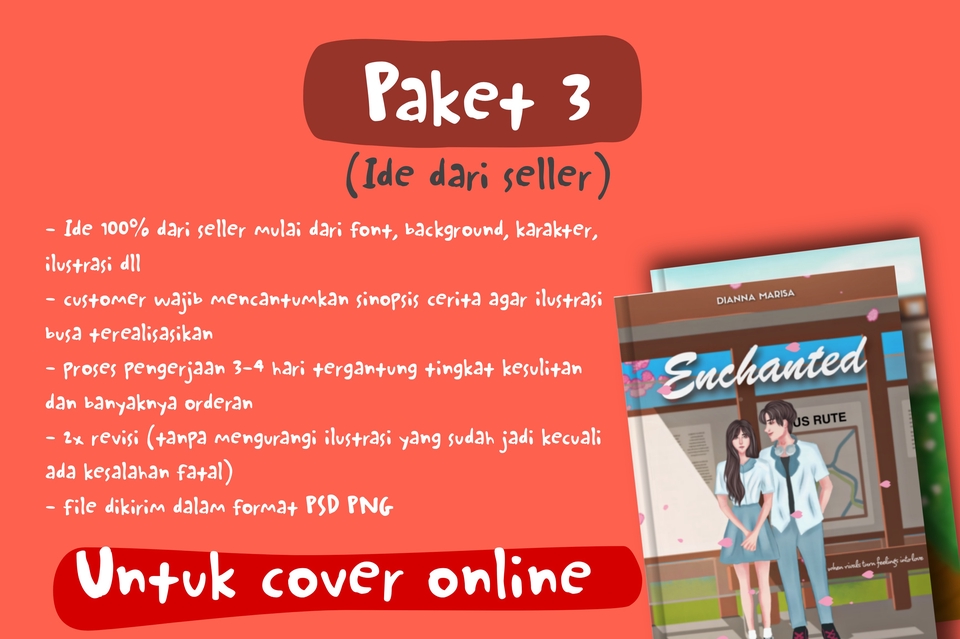 Rp100,0 rb- Ide 100% dari seller mulai dari font, background, karakter, ilustrasi dll - proses pengerjaan 3-4 hari tergantung tingkat kesulitan dan banyaknya orderan - 2x revisi (tanpa mengurangi ilustrasi yang sudah jadi kecuali ada kesalahan fatal) - wajib menyertakan SINOPSIS CERITA agar ilustrasi bisa terealisasikan - file dikirim dalam format PSD PNG - dapat 3 bagian COVER DEPAN | COVER PUNGGUNG | COVER BELAKANG