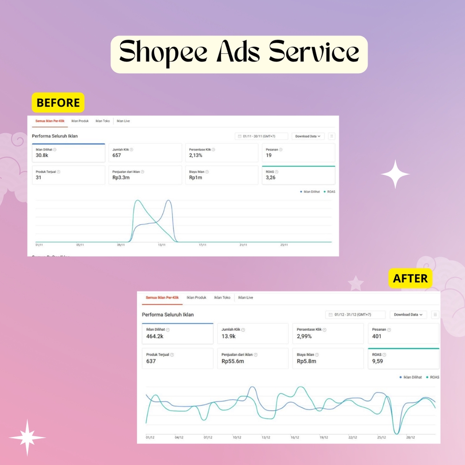 Rp1,1 jt- Bebas konsultasi - Strategi (gambaran umum dan beserta rinciannya) - Pengaturan iklan produk, iklan toko, Shopee campaign, dll) - Pemantauan sales traffic setiap 2 hari sekali - Laporan iklan pada akhir periode
