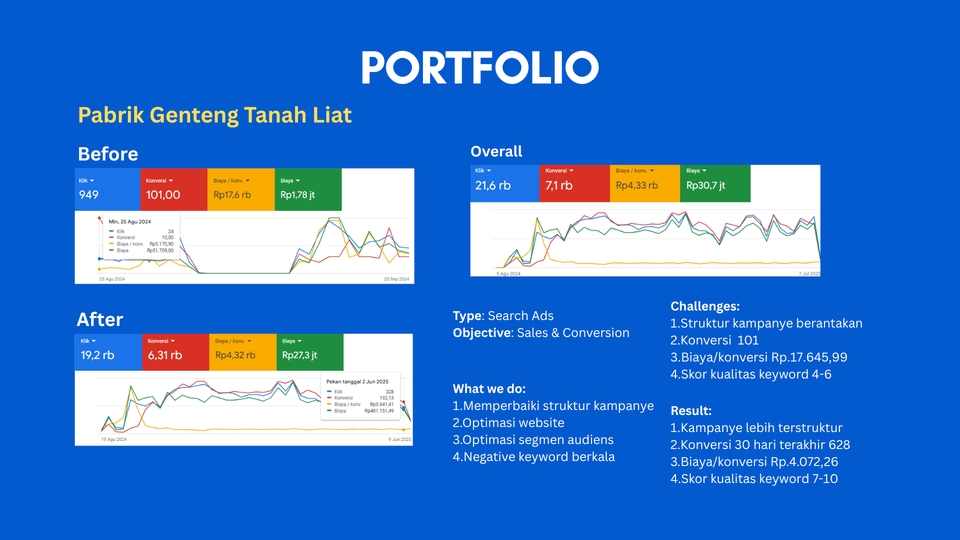 Jasa Optimasi Google Ads Objektif Sales/Leads Alur pengerjaan: 1.Riset kata kunci & rekomendasi anggaran harian 2.Audit website 3.Pembuatan akun Google Ads 4.Setup kampanye Google Ads 5.Setup tracking conversion 6.Input negative keyword 7.Grouping keyword 8.Pembuatan copywriting iklan 9.Pemasangan aset iklan 10.Optimasi iklan berkala 12.Laporan iklan bulanan Note: 1.Jika klien belum memiliki akun Google Ads, tim kami akan bantu buatkan akun google ads baru dan identitas profil pembayaran atas nama klien/perusahaan klien. 2.Kami hanya menerima fee jasa, untuk pengisian saldo iklan dilakukan oleh klien sendiri. Kami akan mengirimkan no. rekening akun Google Ads ke klien. 3.Jika iklan ditangguhkan karena ada masalah pada website klien, maka sepenuhnya menjadi tanggung jawab klien. *Besaran fee menyesuaikan dengan anggaran iklan Kami tidak menjanjikan hasil instan, pencarian iklan winning butuh trial & error. Jika Anda siap untuk kolaborasi? Kami partner yang tepat.