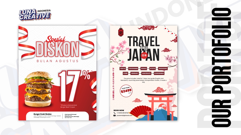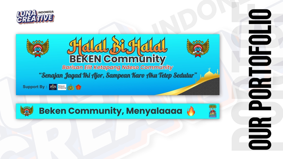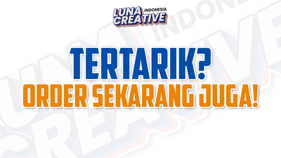 Desain kreatif untuk banner promosi, spanduk acara, atau kebutuhan lainnya. Cocok untuk media cetak berukuran besar yang menarik perhatian. Luna Creative siap membantu kebutuhan Anda! Langkah Pekerjaan 1. Kami akan memulai dengan diskusi untuk memahami kebutuhan Anda, termasuk nama bisnis, target audiens, dan preferensi desain. 2. Setelah itu, kami akan mengirimkan penawaran harga sesuai paket yang Anda pilih dan menyepakati syarat kerja, termasuk jumlah revisi dan file yang akan Anda terima. 3. Kami akan melakukan riset dan membuat konsep desain berdasarkan brief yang telah Anda berikan. 4. Konsep awal desain akan kami kirimkan untuk mendapatkan feedback dari Anda. 5. Kami akan melakukan revisi sesuai masukan Anda hingga desain mencapai hasil yang diinginkan. 6. File akhir akan kami kirimkan dalam format yang telah disepakati. 7. Kami akan melakukan follow-up untuk memastikan Anda puas dengan hasil desain dan, jika berkenan, meminta testimoni untuk portofolio kami.