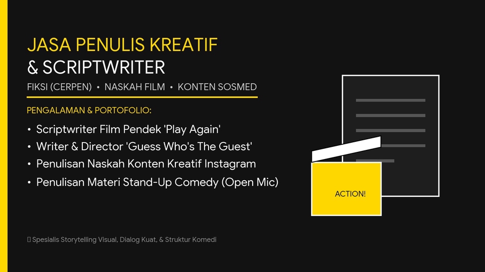 Scriptwriter & Storyteller | Scriptwriter film pendek "Play Again" & Sutradara "Guess Who's The Guest". Berpengalaman menulis naskah konten Instagram & aktif open mic Stand-up Comedy. Saya menggabungkan struktur cerita film dengan kreativitas komedi. Siap membantu proyek penulisan skenario, copywriting konten, dan penyutradaraan dengan hasil yang orisinal dan berkualitas.