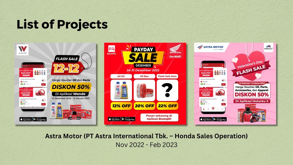 Rp115,0 rb3 DESIGN DENGAN MASING-MASING MAKSIMAL 3 OUTPUT (BOLEH REQUEST UKURAN) File JPG/PNG Working file dikenakan tambahan 30k per design (file dalam bentuk Ai atau Canva) Waktu pengerjaan dapat didiskusikan sesuai kebutuhan klien Revisi (minor) dapat didiskusikan sesuai kebutuhan *Desain untuk keperluan lainnya dapat didiskusikan terlebih dahulu sebelum pemesanan
