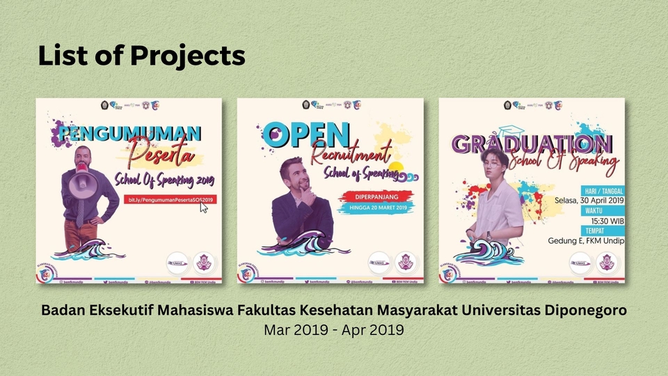 Rp100,0 rb2 DESIGN DENGAN MASING-MASING MAKSIMAL 3 OUTPUT (BOLEH REQUEST UKURAN) File JPG/PNG Working file dikenakan tambahan 30k per design (file dalam bentuk Ai atau Canva) Waktu pengerjaan dapat didiskusikan sesuai kebutuhan klien Revisi (minor) dapat didiskusikan sesuai kebutuhan *Desain untuk keperluan lainnya dapat didiskusikan terlebih dahulu sebelum pemesanan