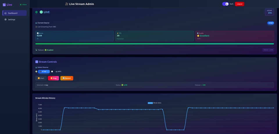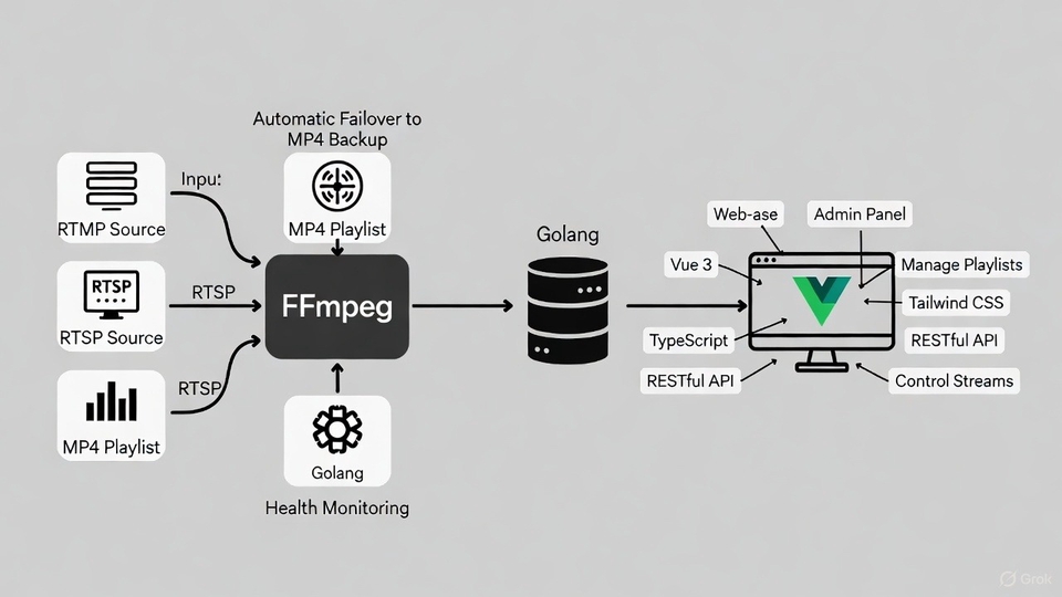 Saya menyediakan sistem streaming 24/7 lengkap yang dibuat untuk re-streaming ke YouTube. Aplikasi menerima sumber RTMP (mis. OBS/vMix), RTSP (IP camera), atau MP4 playlist sebagai fallback; semua diproses melalui FFmpeg dan dikelola oleh backend Golang. Panel admin berbasis web (Vue 3 + TypeScript) memungkinkan Anda mengelola playlist (upload, reorder, loop), mengontrol stream (start/stop/restart), dan melihat metrik serta log secara real-time via WebSocket. Saat sumber utama kehilangan sinyal, mekanisme failover otomatis beralih ke MP4 backup sehingga siaran YouTube tetap berjalan tanpa interupsi. Perlu dicatat: aplikasi melakukan push ke RTMP YouTube menggunakan Stream Key (bukan integrasi metadata YouTube API), sehingga konfigurasi mudah dan kompatibel dengan YouTube Studio
