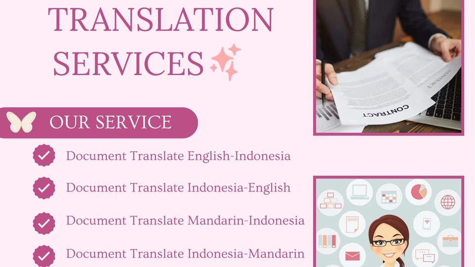Saya mampu melakukan transalte dokumen dengan cepat, maksimal pengerjaan 3-4hari( tergantung jumlah file dan halaman yang dikirim ) . Saya memiliki pengalaman sebagai seorang Translator Dokumen selama hampir 2 tahun.
