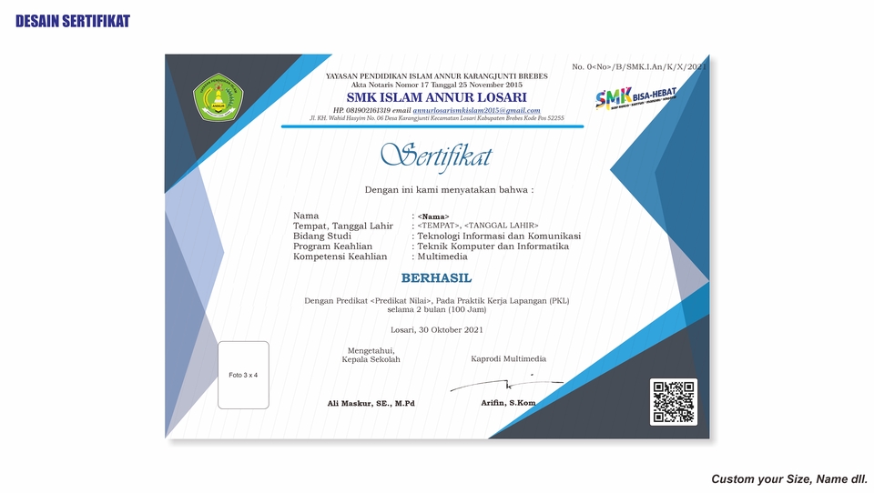 Seorang pria kelahiran Brebes yang kini berusia 26 tahun, dengan profesi sebagai Design Graphic Technology. menguasai berbagai macam aplikasi desain grafis seperti Corel Draw, Adobe Ilustrator, Adobe Photoshop, Canva dan masih banyak lagi. Kelebihan terbesar saya terletak pada kemampuan untuk membuat desain Kemasan, piagam, Brosur dan lain sebagainya