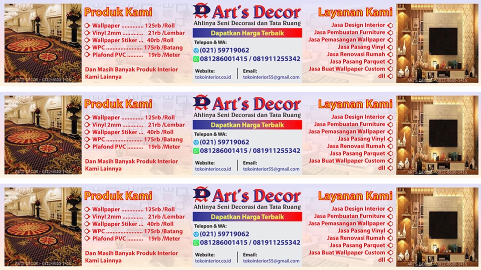 Kami menerima jasa Design Banner untuk berbagai keperluan media Promosi Usaha Jualan dan Bisnis Anda agar orang mudah mengetahui tentang Produk atau Jasa apa yang Anda tawarkan sehingga bisa meningkatkan transaksi penjualan Desain Profesional, elegan serta Berorientasi Penjualan dan Perekrutan akan membantu meningkatkan brand bisnis Anda serta citra perusahaan atau usaha Anda Jangan Ragu atau Sungkan diskusi terlebih dahulu ya, Semoga kita bisa bekerjasama dan saling menguntungkan, saya tunggu diskusinya dari Bapak / Ibu :) Terima Kasih. Langkah Pekerjaan 1. Chat kami dulu untuk diskusi rencana design 2. Anda order jasa kami di website fastwork. id ini 3. Kami segera kerjakan gambarnya 4. Gambar selesai dan Kami kirim File dalam bentuk PDF/JPG