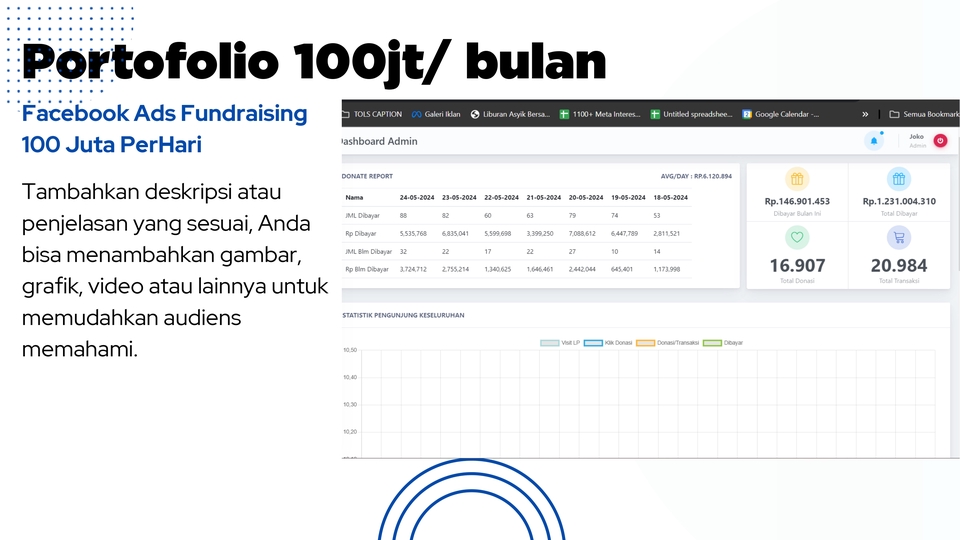 Saya adalah seorang Digital Marketing & Digital Fundraising Specialist dengan pengalaman mengelola kampanye sosial dan penggalangan dana digital melalui Meta Ads Spesialis | Tiktok Ads Spesialis | Google Ads dan platfrom lainya. Keahlian saya meliputi strategi konten, iklan digital, email marketing, hingga optimalisasi landing page yang berorientasi pada konversi.