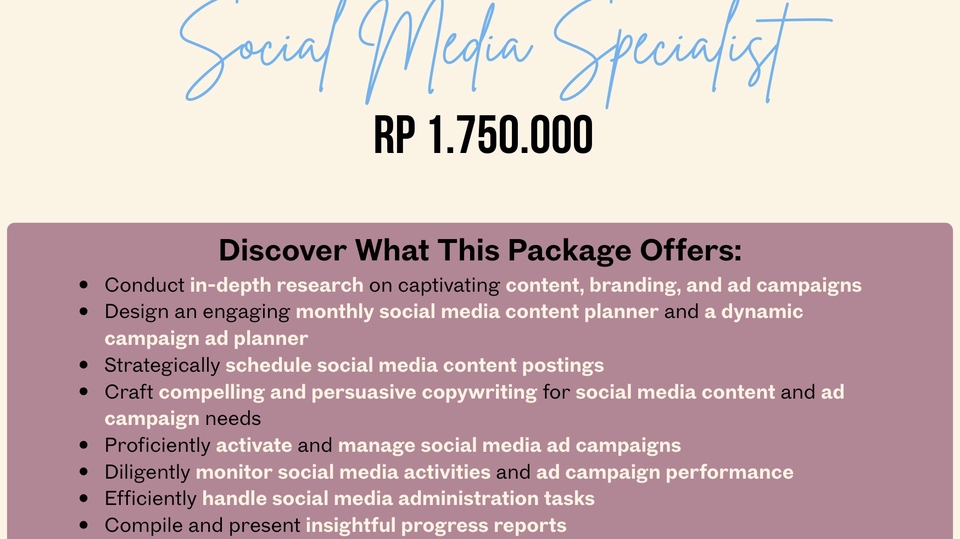 Rp1,7 jtMenyediakan layanan riset konten dan branding, perencanaan konten dan kampanye iklan, copywriting, pengelolaan serta monitoring iklan media sosial, dan laporan perkembangan yang jelas.