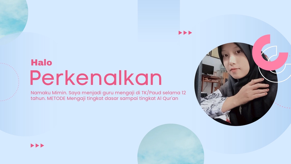 Hai, saya guru TK sudah mengabdi selama kurang lebih 12 tahun sampai sekarang. Belajar mengaji dengan metode otak kanan dan menyenangkan bersama saya.