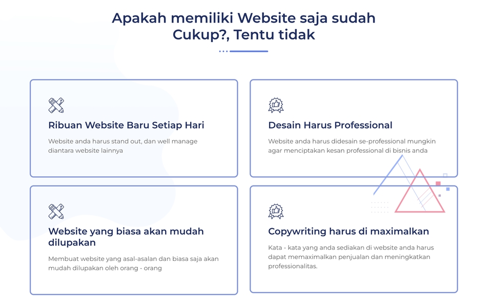 Kami adalah agensi digital yang berbasis di Tangerang, kami telah berdiri dari Desember 2019. Jika anda membutuhkan website dengan performa yang maximal dan juga siap untuk di deliver ke market maka kami adalah solusinya Telah mengerjakan lebih dari 100+ Website dari beragam bisnis maupun UMKM - Responsive - Fast deliver - Sesuai dengan bisnis anda - SEO On-page optimized - Fast load Langkah Pekerjaan 1. Briefing and business understanding 2. Process 3. Review by client 4. Revision 5. Deliver credentials