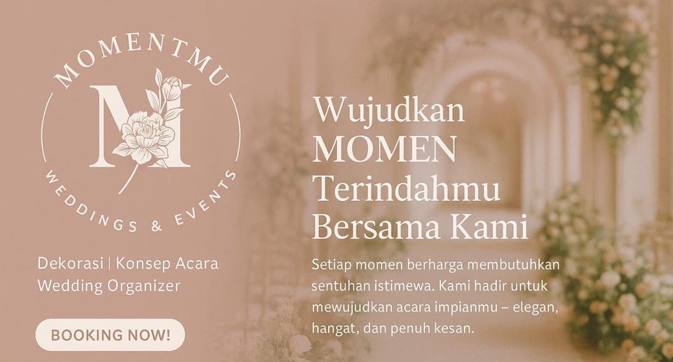 Industri pernikahan Indonesia terus berkembang seiring dengan perubahan gaya hidup dan preferensi generasi muda. Fokus tren pernikahan saat ini tidak lagi pada kemewahan, tetapi pada makna, estetika pribadi, dan pengalaman pribadi yang indah. Banyak pasangan muda ingin menikah dengan cara yang mencerminkan kepribadian mereka, baik dari segi ide, visual, atau alur acara. Namun, mereka sering terkendala dengan waktu, ide, dan keterampilan yang mereka miliki untuk melakukannya. Oleh karena itu jangan khawatir Momentmu hadir sebagai solusi bagi pasangan yang ingin merayakan hari istimewa mereka dengan cara yang asli dan terencana. Momentmu berkomitmen untuk tidak sekadar menjadi penyedia layanan, tetapi menjadi partner kreatif yang menemani pasangan di setiap langkah mereka dari awal hingga hari bahagia mereka tiba. Mereka melakukan ini dengan mengusung gagasan “personalized & heart-centered celebration. Momentmu membawa pendekatan yang hangat, fleksibel, dan detail-oriented untuk menghadirkan momen yang tidak hanya indah tetapi juga bermakna dengan tim yang berpengalaman dalam mengatur acara, desain, dan komunikasi visual. Langkah Pekerjaan 1. Konsultasi Awal dengan Klien 2. Menyusun Tema, Konsep, dan Anggaran 3. Mencari dan Berkoordinasi dengan Vendor 4. Menyusun Susunan Acara (Rundown) 5. Menentukan Lokasi dan Persiapan Teknis 6. Koordinasi dan Technical Meeting 7. Pelaksanaan Hari H 8. Penanganan Pasca Acara