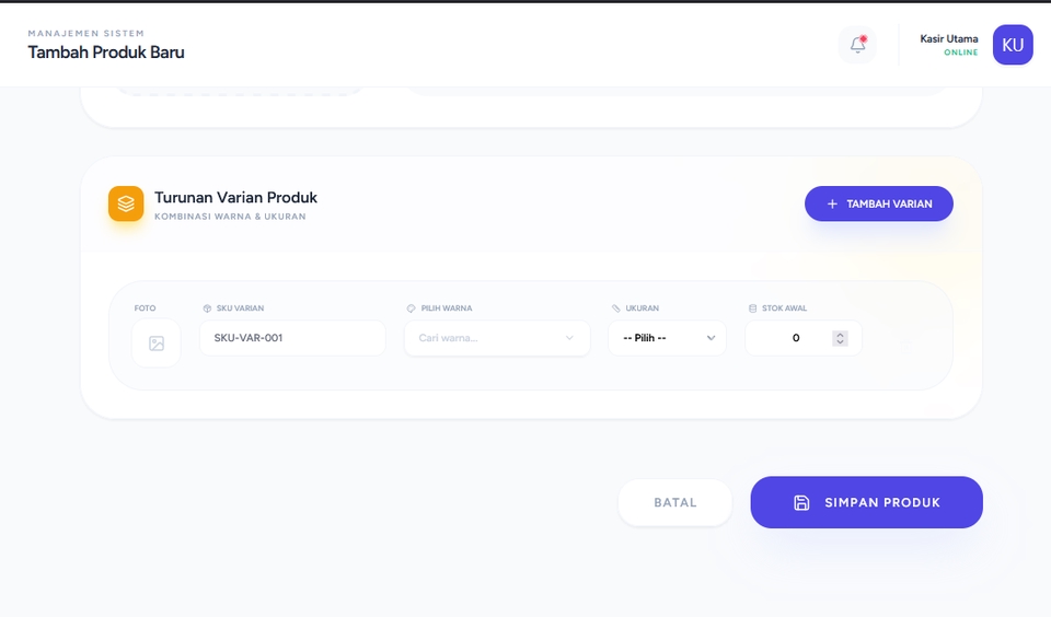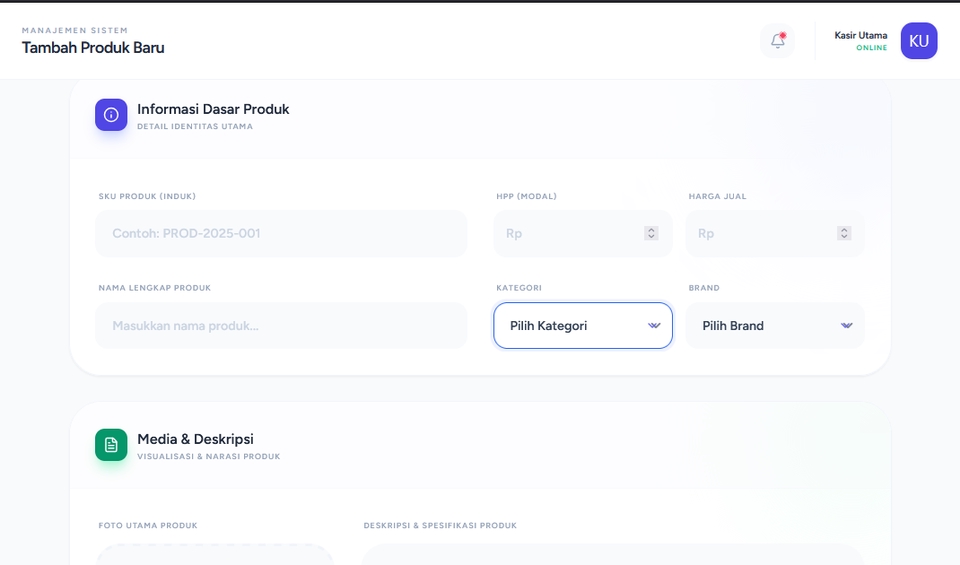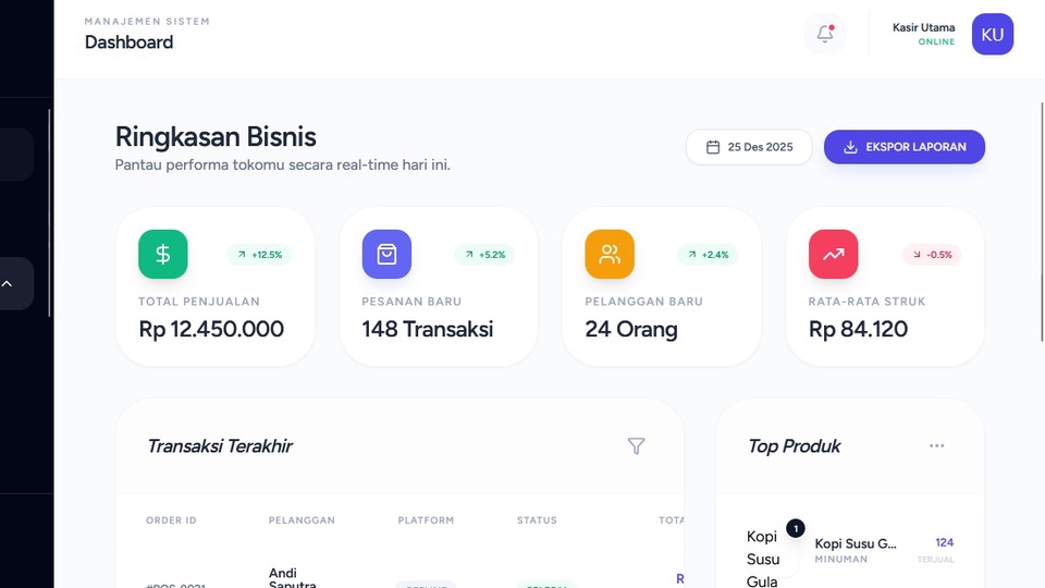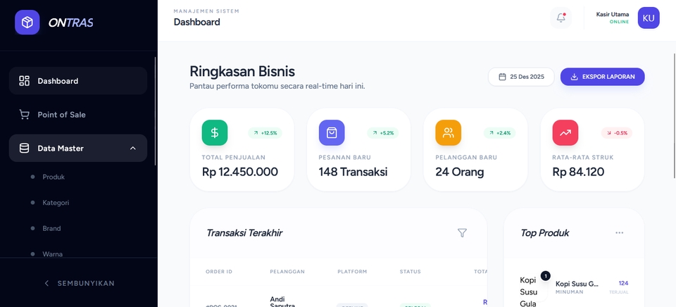 Sistem Point of Sale (POS) adalah aplikasi yang digunakan untuk memproses transaksi penjualan secara cepat, akurat, dan terintegrasi. Sistem ini membantu pelaku usaha dalam mengelola penjualan, stok barang, pembayaran, dan laporan secara real-time, sehingga operasional bisnis menjadi lebih efisien dan terkontrol. Fitur Umum Sistem POS Transaksi penjualan cepat & mudah Manajemen produk & kategori Pengelolaan stok barang otomatis Scan barcode / input manual Multi metode pembayaran (tunai & non-tunai) Diskon, promo, dan pajak Cetak / kirim struk transaksi Manajemen kasir & shift Riwayat transaksi penjualan Laporan penjualan & stok Hak akses pengguna berbasis role Keamanan & pencadangan data