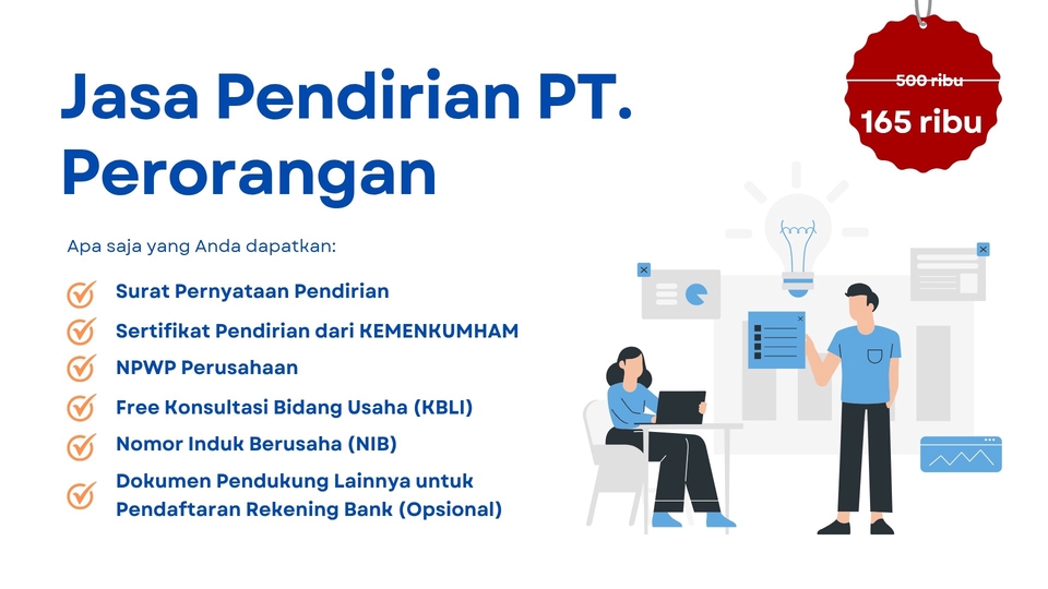 Mau mendirikan PT Perorangan dengan proses yang cepat, resmi, dan tanpa ribet? Kami siap membantu dari awal sampai PT Anda memiliki dokumen lengkap dan siap beroperasi. Hanya dengan Rp165.000, Anda akan mendapatkan: ✅ Surat Pernyataan Pendirian ✅ Sertifikat Pendirian dari KEMENKUMHAM ✅ NPWP Perusahaan ✅ Free konsultasi bidang usaha (KBLI) ✅ Nomor Induk Berusaha (NIB) ✅ Dokumen pendukung lain untuk pendaftaran rekening bank (opsional) Kenapa pilih kami? - Proses cepat dan 100% resmi - Harga terjangkau tanpa biaya tersembunyi - Konsultasi gratis untuk pemilihan KBLI dan legalitas usaha - Dokumen lengkap untuk memulai bisnis dengan legalitas yang jelas Mulai langkah awal bisnis Anda sekarang juga. Klik Pesan Sekarang, dan kami akan membantu sampai PT Anda resmi berdiri!