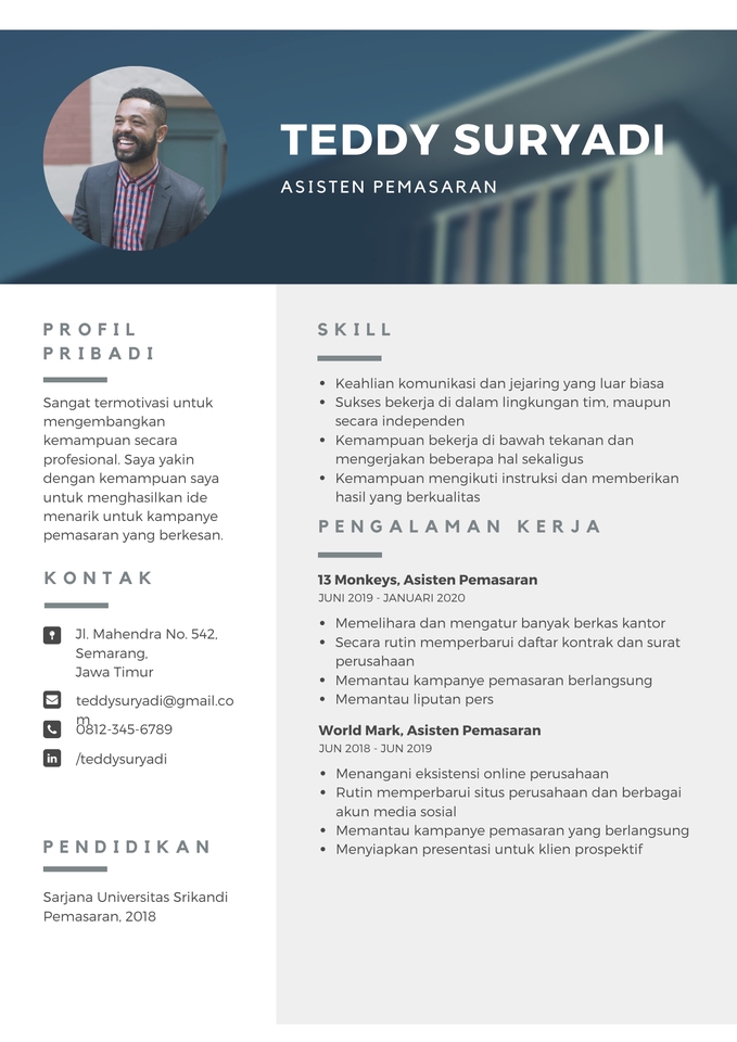 Saya akan membantu anda untuk membuat CV ataupun resume. Anda dapat memilih ingin membuat cv kreatif ataupun cv yang ats freindly sesuai dengan keperluan yang anda butuhkan. Langkah Pekerjaan 1. Pelanggan memberikan brief desain yang diinginkan (pelanggan bebas memilih desain jika memiliki refrensi, jika tidak saya sudah siapkan template untuk dipilih) 2. Kirim detail informasi diri beserta foto dengan resolusi tinggi 3. Pelanggan melakukan pembayaran 4. Proses pengerjaan desain cv dimulai 5. Memberikan overview hasil desain cv kepada pelanggan 6. Pelanggan memberikan feedback atau revisi 7. Proses pengerjaan desain sesuai revisi (jika ada) 8. Mengirimkan hasil desain cv akhir 9. Pelanggan menyetujui hasil akhir kerja dan memberikan ulasan