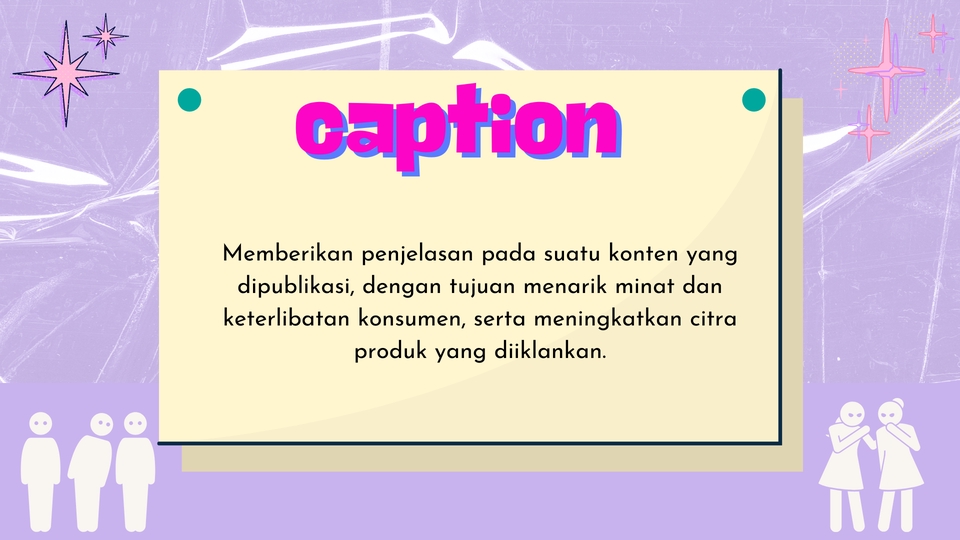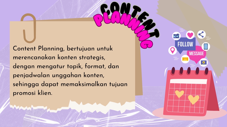 Yuk, jadikan kontenmu kece dan relevan dengan jasa kami! Kami adalah tim kreatif yang siap membantumu merancang konten planner yang bikin feedmu jadi kece dan bikin followersmu terpana. Dari copy writing sampe caption, kami punya senjata rahasia buat bikin kontenmu beda dari yang lain. Let's make your content pop! Apa aja yang bisa kamu dapetin dari layanan kami? 1. Content Planner (Rancangan konten): Kita bakal bantu kamu merancang konten yang nge-hits dan sesuai sama identitas brand kamu. Jadwal posting dan ide kreatif? We got it covered! 2. Copy Writing: Butuh tulisan yang eye-catching buat bikin pengikutmu engaged? Nggak usah khawatir! Tim kami siap menghadirkan kata-kata yang bikin scroll jadi stop! 3. Caption: Caption itu penting banget, kan? Kita siap bantu kamu dengan caption yang bikin followersmu terpukau dan pengen ikut komen! 4. Creative Idea: Kita punya segudang ide kreatif yang siap bikin kontenmu beda dari yang lain! Oh ya, paket kami nggak termasuk pengeditan dan desain konten, tapi tenang aja, kita fokus buat ngebuat ide-idemu makin nyata di media sosial! Let's make your social media shine! Langkah Pekerjaan 1. Klien melakukan konsultasi terkait target yang ingin dicapai, lalu melakukan kesepakatan dengan kami 2. Kami melakukan pengerjaan sesuai briefing, lalu mengirimkan file pada klien setelah selesai 3. Klien dapat mengajukan revisi sebanyak kuota yang ditetapkan jika memang dibutuhkan