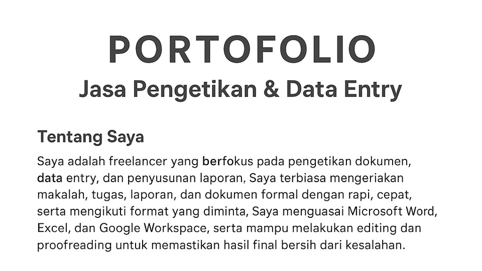 Saya adalah freelancer yang berfokus pada pengetikan dokumen, data entry, dan penyusunan laporan. Saya terbiasa mengerjakan makalah, tugas, laporan, dan dokumen formal dengan rapi, cepat, serta mengikuti format yang diminta. Saya menguasai Microsoft Word, Excel, dan Google Workspace, serta mampu melakukan editing dan proofreading untuk memastikan hasil final bersih dari kesalahan.