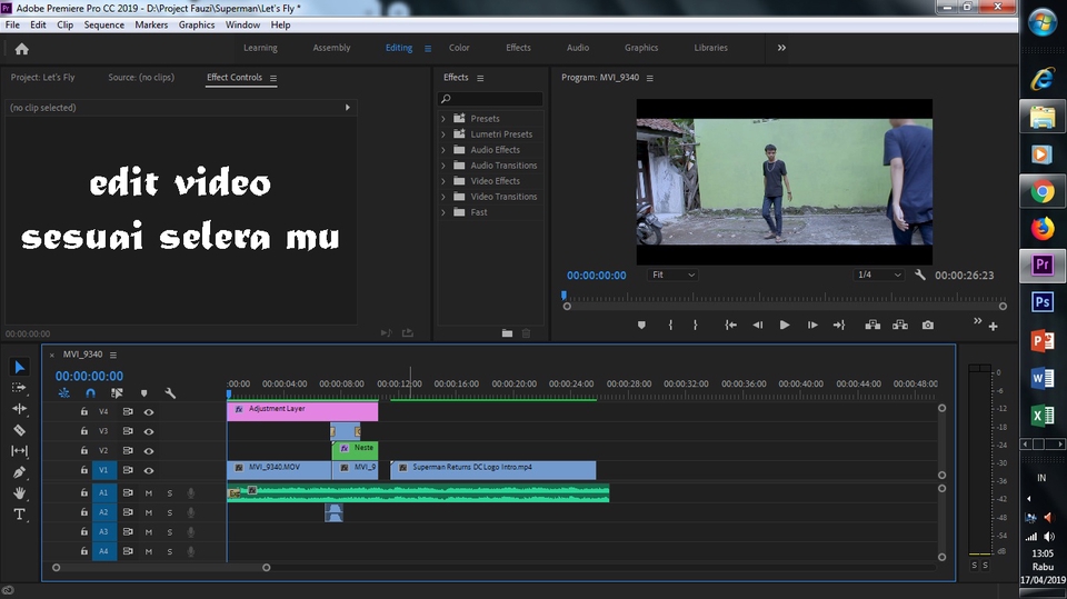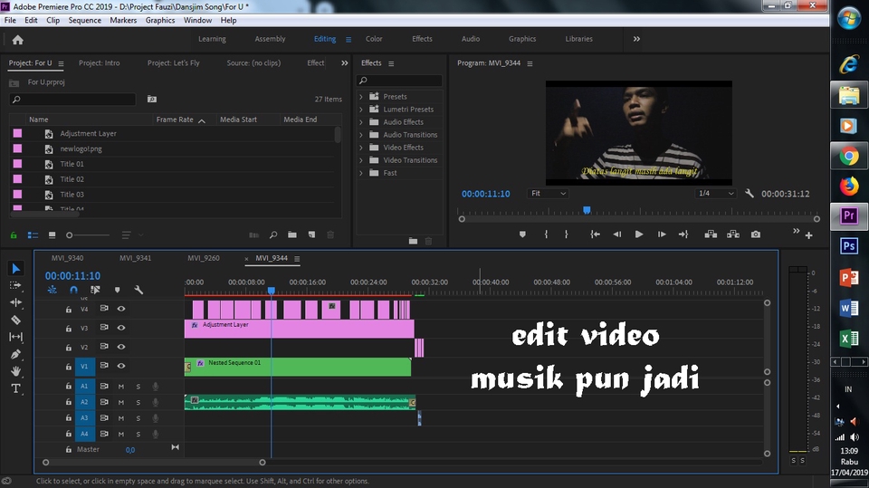 Edit video mu agar lebih keren dan menarik. Keterangan lebih lanjut Saya akan melakukan editing video anda sesuai dengan kebutuhan baik untuk youtube atau media sosial lainnya. Langkah Pekerjaan 1. Kirimkan video mu 2. Bicarakan storyboard atau konsep dari video mu
