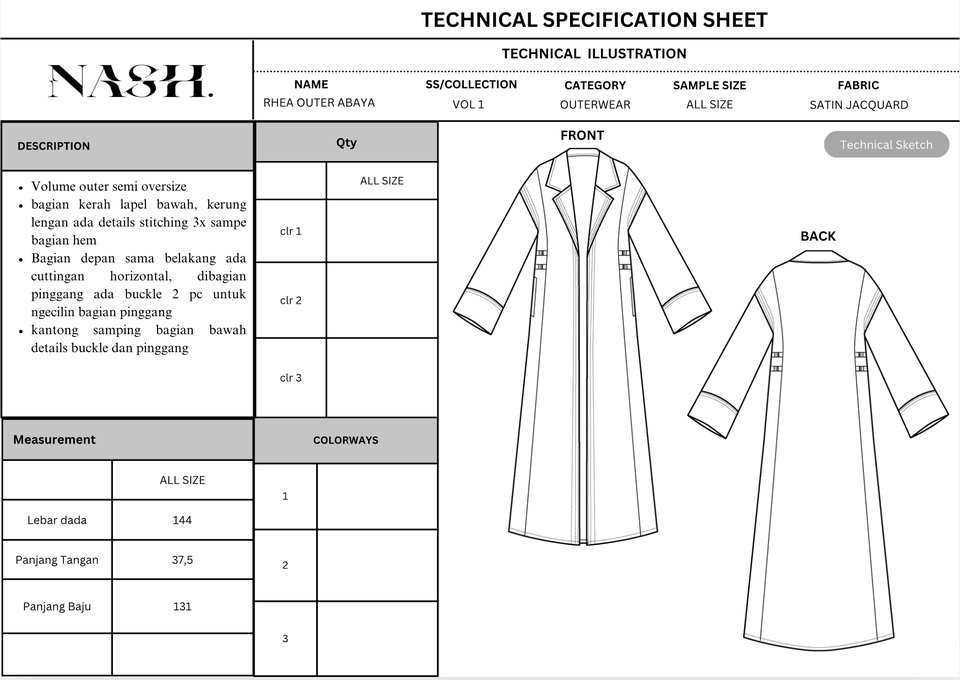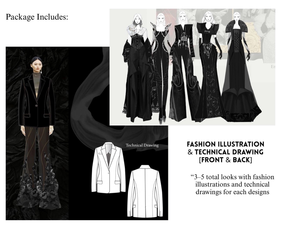 Hallo! Aku menyediakan jasa fashion design untuk fashion business owner, meliputi: -Fashion Illustration -Technical Drawing / guideline untuk produksi (depan,belakang,details) Langkah Pengerjaan: 1. Klien menjelaskan konsep desain yang diinginkan mulai dari style, warna dan bahan yang akan digunakan. 2. Klien dipersilahkan mengirimkan gambar sebagai referensi. 3. Klien memilih paket yang tersedia. 4. Klien melakukan payment 5. Desain dikerjakan. 6. Klien dipersilahkan revisi minor. 7. Desain final akan diberikan dalam format PDF atau sesuai kebutuhan. Terms & Condition: - Waktu pengerjaan 2–7 hari (atau lebih, tergantung tingkat kerumitan desain). - Termasuk minimal 1x revisi gratis; revisi tambahan akan dikenakan biaya. - Pemesanan dalam jumlah desain lebih banyak berhak mendapatkan diskon khusus. - Klien diharapkan menyiapkan konsep/moodboard secara detail (misalnya: penggunaan payet, motif bordir, bentuk siluet, warna, jenis kain, dll) agar hasil desain lebih sesuai dengan kebutuhan.