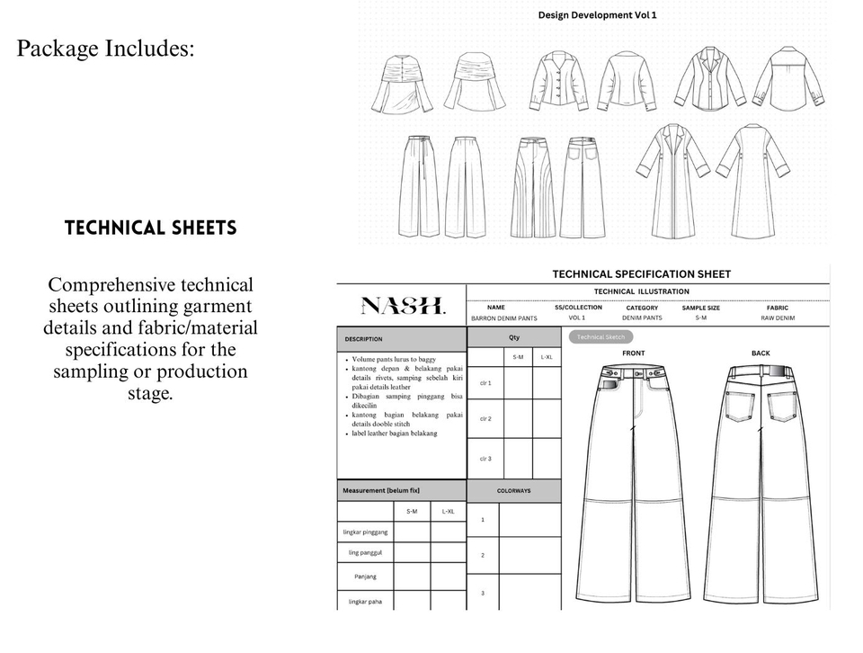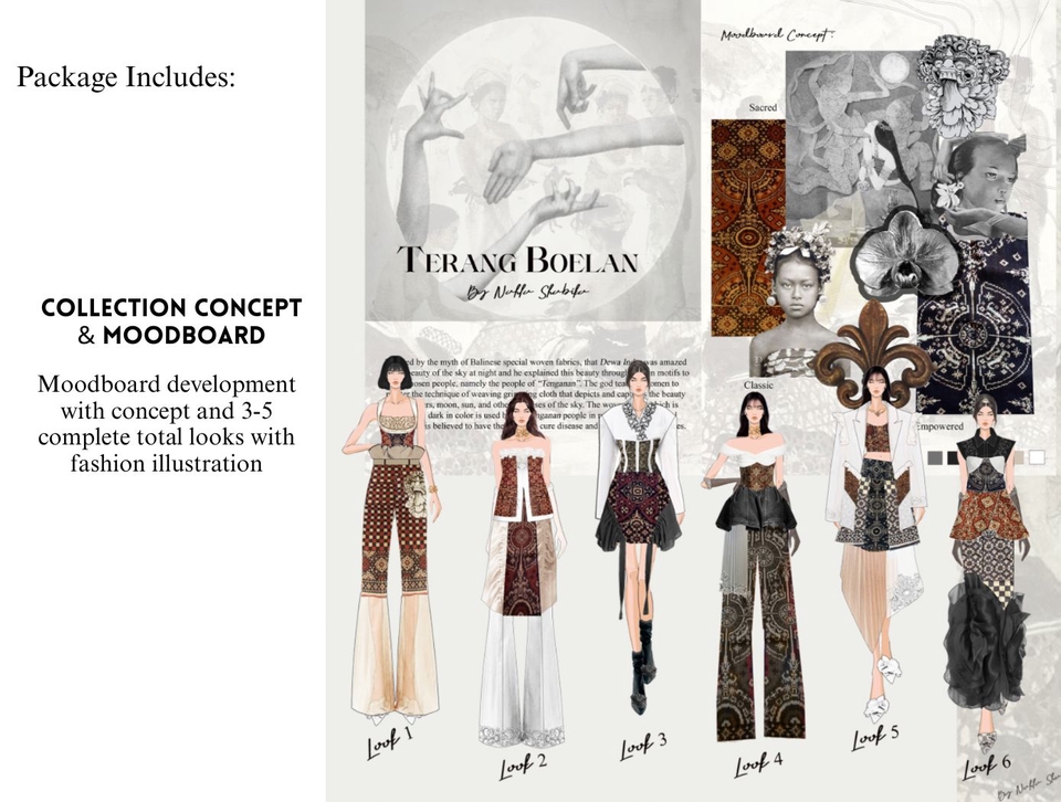 Rp950,0 rb- Moodboard with 5total look - 5-6 Fashion Illustration (with mockups fabric) - Technical drawing/pack of each design (front & back) - Technical Sheets of 5 total look