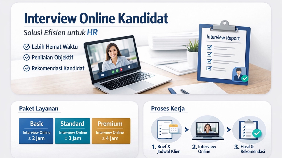 Rp199,0 rbCakupan: Interview online kandidat hingga ±2 jam Durasi interview fleksibel per kandidat Catatan hasil interview Ringkasan penilaian Rekomendasi singkat kandidat