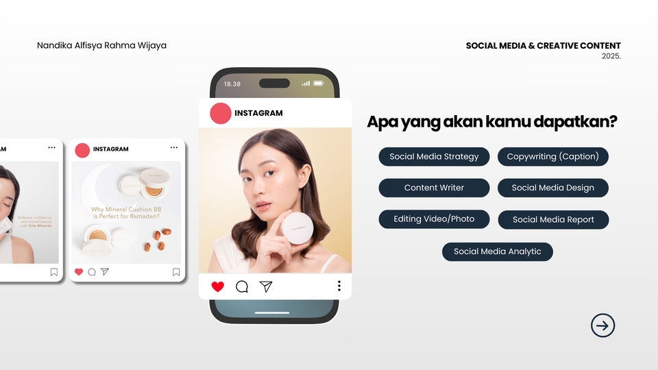 Hai, saya Nandika, profesional di social media marketing sejak 2020. Berpengalaman bekerja dengan brand fashion, klinik kecantikan, dan UMKM. Ahli dalam content planning, copywriting, graphic design, hingga product styling dan KOL Specialist. Saat ini, saya menjabat Head of Brand Marketing di Donna Prive, mengelola strategi online dan offline. Siap bantu brand Anda tampil maksimal! 🚀
