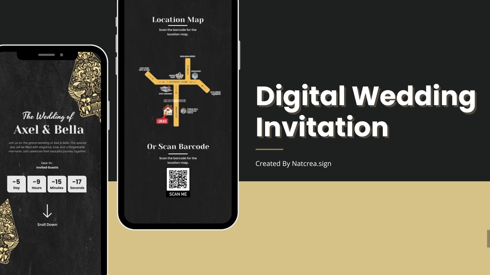 Desain undangan digital dengan tema adat jawa, teridiri lebih dari 5 halaman undangan dengan informasi lengkap termasuk info rsvp, detail acara, lokasi, scan barcode, komentar, dll.